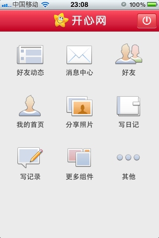 人人网的iPhone应用的界面和Facebook非常像,也是九宫格布局,连配色都差不多,人人网是由千橡集团将旗下著名的校内网更名而来,是国内较大的SNS社交网站之一。