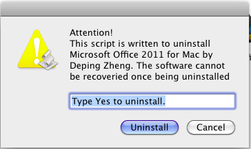 Microsoft Office 2011 for Mac Uninstaller是Office 2011 for Mac的缷载程序。安装了Microsoft Office 2011 for Mac后,发现竟然没有卸载程序,大概Microsoft认为我们安装以后都用不着卸载吧,可是毕竟Office这么庞大的软件不像其他的软件,直接丢到垃圾桶里能解决的。因此自已参考Microsoft官方的手工卸载回复,编写了这个自动化缷载程序,分享一下。Dock上的图标需要手工删除,编码太麻烦了。This script is written to uninstall Microsoft Office 2011 for Mac since Microsoft does not provide such official uninstaller. Anyway, credits to Microsoft official support, what I did is putting all manual uninstall steps together as an automatic uninstall script. You have to remove Office icons from the Dock manually because I don't how to remove items from the Dock through terminal command.