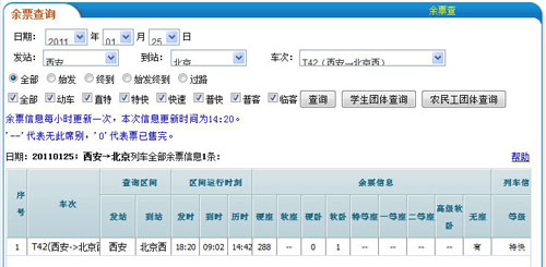 西部e网小编icech查询了一下,输入“1月25日西安到北京的T42车次”,查询结果是:288张硬座,0张硬卧,1张软卧。昨天,铁路客户服务中心开通试运行,旅客可上网查询客票余额情况。铁路部门在全国18个铁路局(公司)所在地分别设立铁路客户服务中心,并采取电话语音查询、人工在线服务和12306网站(www.12306.cn)信息查询、客户