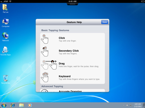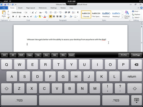 VMware发布了一个解决方案,让iPad的企业用户可以直接从平板上用触控的方式使用自己的Windows电脑。该应用被称为VMware View app,专门用于企业用户连接自己的办公电脑或数据中心,该程序可在3G和Wi-Fi模式下进行连接,利用特殊的手势实现对Windows桌面的管理,同时还支持蓝牙iPad物理键盘甚至是可以通过iPad VGA适配器将视频信号传送到外部监视器和投影仪。