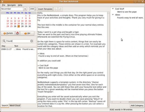 RedNotebook 是一款不错的开源笔记软件。支持Windows和Linux环境桌面。不论是拿来写日记,还是写些简单的每日计划,都非常适用。界面还是很简洁的。右边的边栏是个单独的区域,可以在里面建立分类的文本,非常适合来记录计划、灵感,或者今日大事。