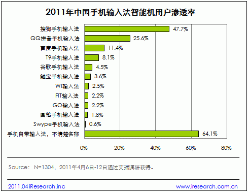 据艾瑞4月调研数据显示,智能手机用户中,搜狗品牌知名度最高。知道搜狗手机输入法的用户比例达到92.9%,搜狗手机输入法用户渗透率排名也居各大品牌之首,47.7%的智能机用户使用过搜狗手机输入法,QQ手机输入法的这一比例为25.6%,百度手机输入法为11.4%。