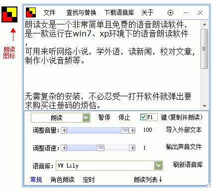 朗读女是一个非常简单且免费的语音朗读软件,是一款运行在win7、xp环境下的语音朗读软件 , 可用来听网络小说,学外语,读新闻,校对文章,制作小说音频等。无需复杂的安装,不必忍受一打开软件就弹出要求购买注册码的烦恼。你要做的就是下载本软件,然后在下载页面,试听语音库朗读效果,再下载一个你认为朗读声音最好的语音库,安装即可使用本软件进行朗读了。