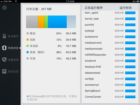 用iPad上的360形容QQpad关键一定让腾讯很不爽,不过这不也是他的目标吗?继QQ手机管家iPhone版正式发布后,QQPad管家也强势登陆App Store。QQPad管家是由腾讯公司开发的一款简单易用的iPad管理软件,目前提供了电池维护、内存状态显示、流量监测、系统信息展示等实用功能。