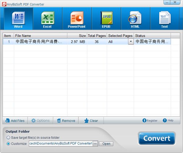 AnyBizSoft PDF转换器是一个全面的PDF转换工具,它可以帮助您将PDF转换为的Word,PowerPoint,HTML和文本。全格式转换结果可以很容易地编辑MS Word文件,在PowerPoint演示文档,PDF文件、HTML页中释放文件或者仅复制文本文件PDF格式文本的PDF文件。 批量转换和加密的PDF文件转换的支持,这使得您的转换效率更高。