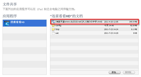 通过USB线将电影拷贝到iPad上,这是一个颠覆性的技术创新。首先我们必须先在iPad上安装迅雷看看HD 3.1版,之后将iPad通过USB连线将iPad连接到PC上(如图1),再并启动iTunes。单击左侧“设备”下方我们的iPad,再单击中间“应用程序”标签,可以看到中间窗格出现“迅雷看看HD”,单击它,在右下角单击“添加”按钮即可将影音文件上传到iPad上(如图2)。这样,即可将影音文件直接通过USB连线传输到iPad上供播放(如图3)。