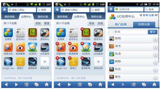 打造一个自由的Web APP平台。基于U3内核的核能力,UC8的扩展更加自由和平台化。UC基于UC8推出了一个高可扩展的Web App平台。在这个平台上,用户可以自由选择、安装、使用、管理多种Web应用,如新浪微博、Flash社交游戏等。未来UC还会不断在UC浏览器上进行更多更有趣的应用和特性扩展。