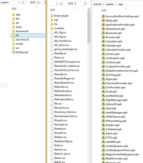 根目录下是一个boot.img,这就是Android系统的bootloader,也就是启动分区。另外有个system目录,这就是Android系统的system分区。进入system目录往下看: