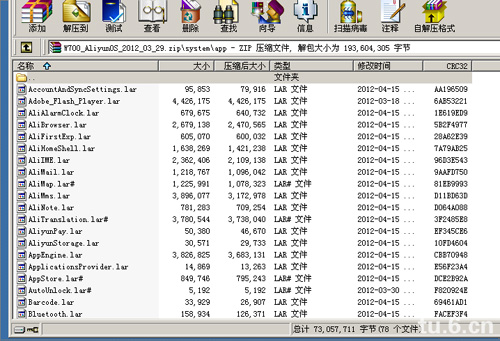 好,看出区别来了,Android下所有的app都是以apk结尾的,前一篇帖子用的ROM就是Android的ROM,里面对应这张图里的文件就都是apk的。这里怎么都是lar呢?这就是阿里云OS和Android不同的地方了,因为apk是Dalvik虚拟机管理应用程序的文件格式,阿里云自己搞了个虚拟机,用lar文件来管理。lar文件和apk文件有什么不同?我们知道apk文件其实就是一个zip文件,用WinRAR可以直接打开看,那lar文件呢?用WinRAR果然也可以直接打开: