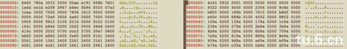 左边的是Android应用的dex文件,右边的是阿里云应用的lex文件。可见,文件格式已经完全不一样了。