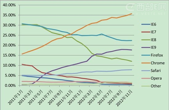 从全球浏览器市场份额来看,Chrome 的用户量步步攀升,至2012年11月,Chrome占有量超过35%;再加上对HTML5支持度一贯很好的Firefox和Safari浏览器,目前对HTML5支持度较好的浏览器实际占有量达66%。