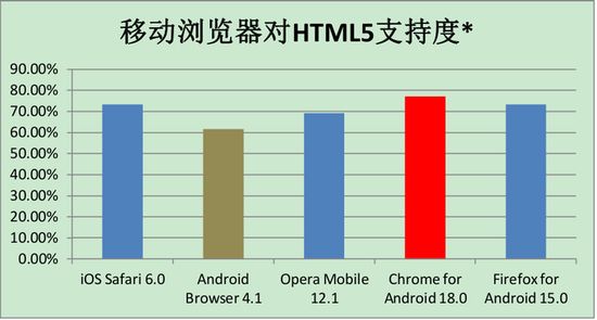 行动平台上主流的5款浏览器(iOS Safari 6.0、Android Browser 4.1、Opera Mobile 12.1、Chrome for Android 18.0、Firefox for Android 15.0),目前对标准的支持度均高于60%。其中表现居首的是Chrome for Android,而支持度相对较低的Android系统自带的浏览器Android Browser对HTML5的支持度也在60%以上。