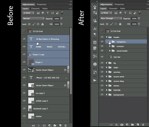所以说,合理组织图层,异常重要,尤其是团队工作,需要把PSD文件传给同事的时候。
