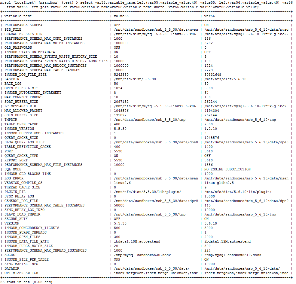 作为 MySQL 5.5 和 5.6 性能比较的一部分,我研究了下两个版本默认参数的差异,为了了解差异内容,我使用如下的 SQL 语句分别在 MySQL 5.5 和 5.6 版本进行查询,得出下表: