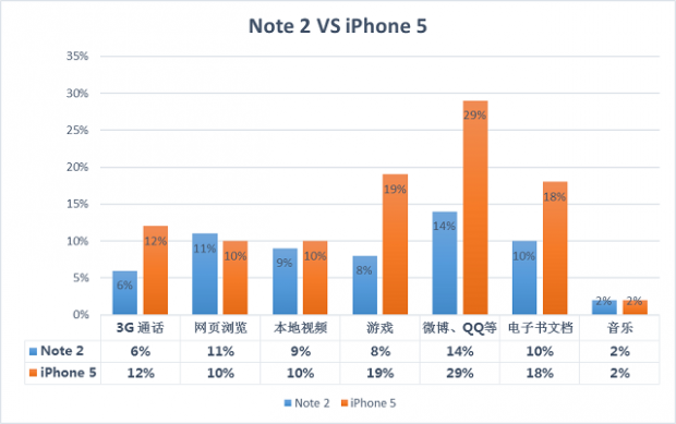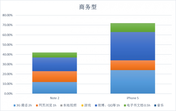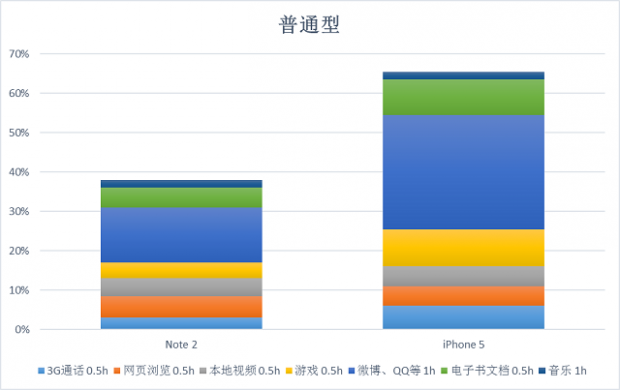 我们分别测试了Note2与 iPhone 5 一个小时的3G通话、网络浏览(默认浏览器,亮度均为50%,下同)、本地视频观看(720P)、游戏(水果忍者等游戏)、使用微博QQ(社交、资讯类网络应用)等、电子书文档阅读、音乐等,结果如下图:
