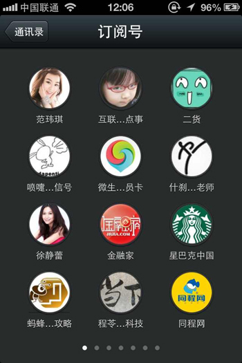 微信5.0版的公众账号APP化趋势更加明显,首先是展现方式由现在的列表改为圆形图标显示(记得有人曾经YY过这个展现形式,不过图标是方的)。