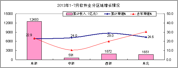 1-7月,西部地区完成软件业务收入1872亿元,同比增长29%,高出全国平均增速5.2个百分点,其中重庆、陕西保持30%以上增长。中部地区完成软件业务收入591亿元,同比增长24%,增速比去年同期提高10.5个百分点。东部和东北地区分别完成软件业务收入12493和1651亿元,同比增长22.9%和24.6%,增速低于去年同期2.4和2.1个百分点。