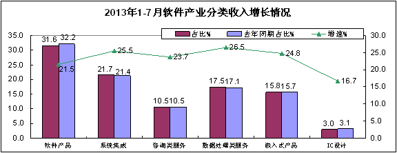 2013年1-7月,我国软件和信息技术服务业稳中有落态势趋于明显,收入增速低于上半年各月水平,但出口有所回升,效益情况持续改善。具体呈现出如下特点: