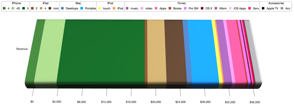 上述 Asymco 的图表很直观地揭示了苹果各条产品线对于它的重要性。显然,iPhone 是占第一位的。