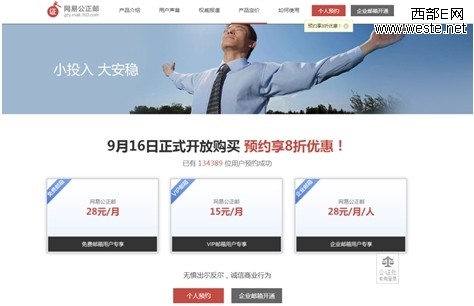 据网易邮箱的负责人介绍,网易公正邮将于9月16日正式上线,而在9月2日-15日期间提前预约的用户,可以享受9月16日当天的8折购买资格,用户只要登录公正邮的官网gzy.mail.163.com,点击“个人预约”进行预约登记即可。目前,免费邮箱用户申请使用的费用是336元/年,VIP邮箱用户则可以享受更多优惠,使用费用仅需180元/年。此前,网易公正邮已经在网易企业邮箱上线。