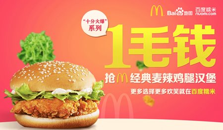 记者在调查中了解到,本次活动由百度糯米、百度地图与麦当劳联合发起,在9月30日至11月30日期间,用户在全国各地有麦当劳门店的城市均可参加这一活动。这也就意味着十一长假打算去外地旅游的市民,也有机会用百度糯米客户端花1毛钱吃麦当劳经典鸡腿堡。