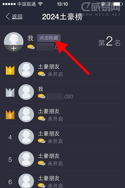 在这里,可以看到你和你的土豪朋友的排行。前几天还是白花花的数字显示,最近朋友们也学会了这个方法。直接点击自己头像右侧的“点击隐藏”按钮;
