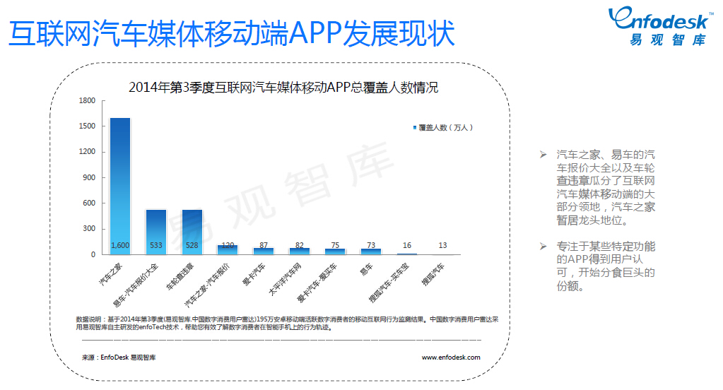 日前,国内权威数据机构易观智库发布了《2014年第3季度中国互联网汽车媒体市场专题研究报告》报告指出,受益于汽车行业的爆发式增长,中国汽车网站获得了前所未有的增长空间。报告显示,汽车之家、易车、太平洋汽车网、爱卡汽车、分居1-4名,这一梯队以垂直汽车网站为主。搜狐汽车、腾讯汽车、凤凰汽车、新浪汽车、网易汽车居后,这一梯队以门户汽车网站为主。