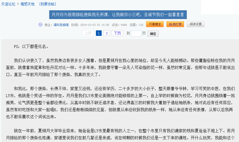12月23日凌晨,天涯社区惊现一篇“神帖”,网友“请叫我痴情”于天涯情感天地版块发帖,自称LY市富二代,声称愿意做同城已婚女士“夏倾月”的小三。惊世骇俗之言引网民围观。据了解,天涯情感天地版块是中国最大的情感生活板块之一,见惯了“奇葩事”的网友们,仍被“请叫我痴情”的大胆言论所震撼,由于该帖内容离奇古怪让追读者欲罢不能,虽凌晨时分仍有少许网民意兴阑珊频频催更。