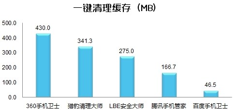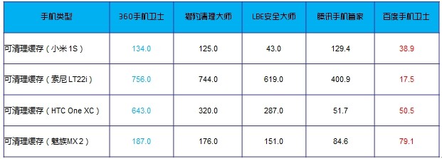 在相同操作情况下,360手机卫士在四款参测机型中的一键清理缓存的清理力度最强,高于腾讯手机管家、猎豹清理大师、LBE安全大师和百度手机卫士。表现适中的有猎豹清理大师、LBE安全大师。清理缓存较小的有腾讯手机管家以及百度手机卫士。