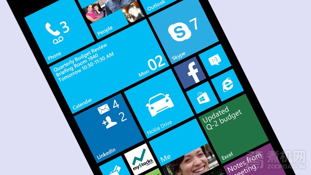 WP8.1 的桌面以动态磁贴的形式呈现,一个磁贴代表一个应用程序入口,并支持磁贴尺寸的改变(目前支持三级尺寸变化),并加入定制化背景,任何图片都可以作为壁纸,从而改变了以往单色调的呈现方式。值得一提的是,WP 系统磁贴可以在不打开应用程序的情况下,实现动态信息的交互,这在 iOS 和 Android 中是没有的。另外,WP 系统向右滑动后得到二级菜单,里面装有所有程序的图标,并且程序卸载也可在这一级菜单中完成。