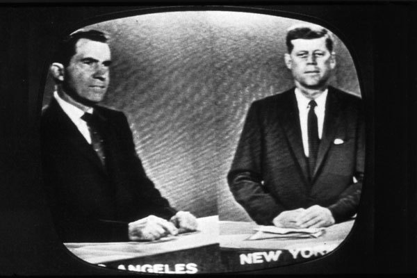 1960年:第一次总统候选人电视辩论中,马塞州参议员J. F. 肯尼迪从汗流浃背的副总统尼克松手上夺走了观众,赢得了选举。
