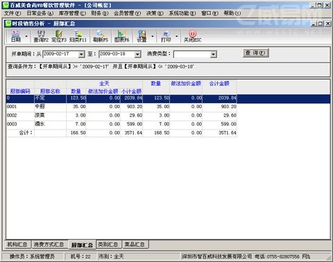 百威美食尚V8餐饮管理软件包含了餐饮前台的预定、点菜、厨房分单、前台结算、客户管理、会员卡管理和后台的购、销、存、成本分析、经营分析等完备的一体化功能。支持触摸屏、PC机、PDA、点菜宝等多种点菜模式,可以处理预定、点菜、厨房传菜、前台打印、结帐打印、菜单维护、原料进销存、客户管理、菜品分析、成本分析、经营分析等几乎所有的餐饮管理业务,轻松完成从点菜、打印、结帐、采购、库存、核算的一条龙管理。