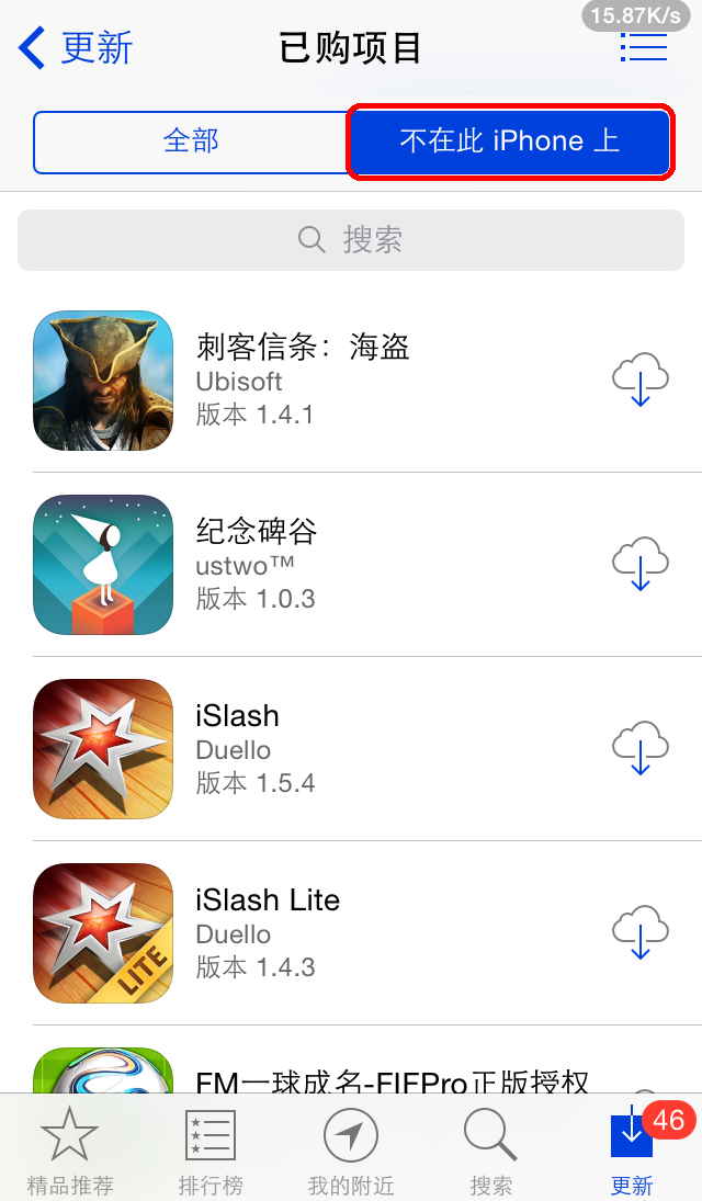 第三步:在「已购项目」界面选中「不在此 iPhone 上」标签来过滤掉目前已安装在 iPhone 上的应用程序。