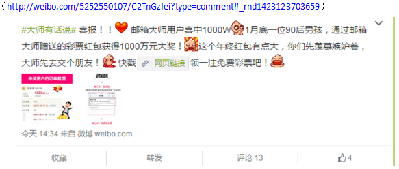 这一消息得到了网易公司的证实。昨日,邮箱大师的官方微博公布了这个消息,证实确实有一位用户在“下载邮箱大师送彩票”的活动中夺得1000万大奖。