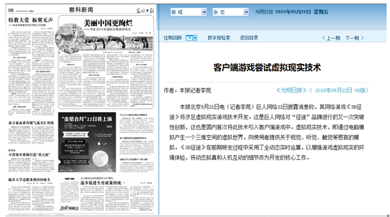 光明日报今日刊发题为《客户端游戏尝试虚拟现实技术》的文章,证实了巨人网络《3D征途》将涉足虚拟现实游戏技术开发的消息,并评价这是巨人网络对“征途”品牌进行的又一次突破性创新,这也是国内首次将VR技术引入客户端游戏中。