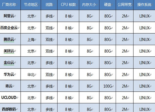 所选择的云主机基础硬件环境均为8核CPU(腾讯、美团、青云为虚拟机CPU),8GB内存,2M带宽,系统为Linux 2.6.32的64位版本。监测覆盖了百度云、美团云、腾讯云、金山云、阿里云、青云、西部数码、首都在线、ucloud、华为云、天翼云、安畅网络、沃云等国内主流云服务商。