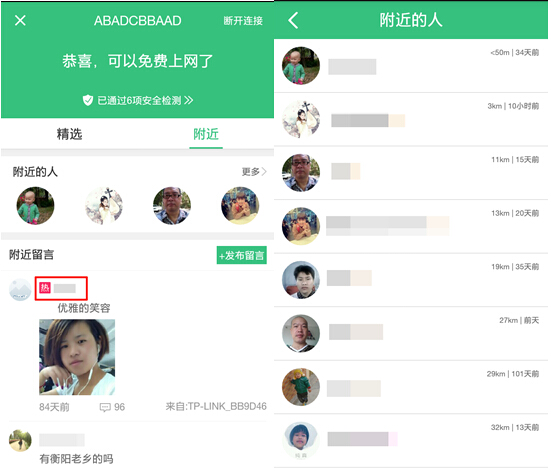 此外,为了方便用户第一时间查看应用内的精彩内容,WiFi畅游V4.9版本在连网成功后将会自动跳转到精选页面,这个页面会展示正在进行的精彩活动以及其他趣味内容。在精选页面还能够直接查看附近的人和附近的留言,可以随时随地和附近的TA来一场美妙的邂逅哦。