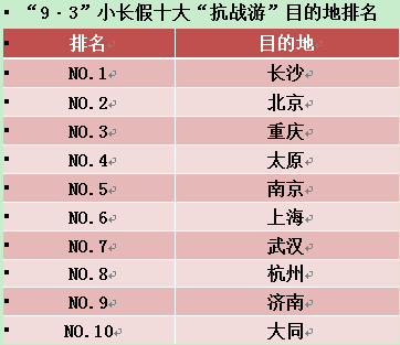 受整体节日气氛的影响和抗战史实的大量普及,不少人选择前往各大抗战遗址旅游。《报告》数据显示,“9•3”小长假期间的十大“抗战游”目的地为:长沙、北京、重庆、太原、南京、上海、武汉、杭州、济南、大同。十大“抗战游”目的地均对应了抗战史上的一些著名战役或重大历史事件的纪念场馆,如长沙会战、卢沟桥事变、太原会战、南京大屠杀纪念馆、淞沪会战、武汉会战、平型关大捷等。