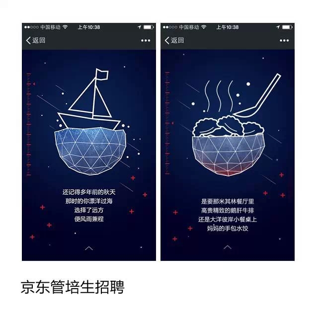 2 / 背景动效其实比较推荐缓动效果,如“京东管培生招聘”的例子里星空中一闪而过的流星,间歇性出现不抢主角风头再好不过了.