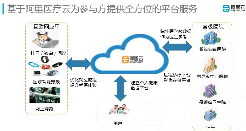 借助阿里云的云存储平台,医院及患者可实时上传影像资料、检验报告等信息,为患者建立真正属于自己的电子病案,便于患者异地就诊时调取历史数据;通过云计算与大数据分析技术,实现远程医疗、健康管理指导、药品追踪、基因测序等功能。