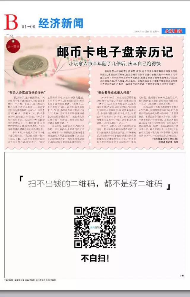 但也要承认的是,既然先行者已经取得了巨大成功,后来者往往会被当坐跟风者。各个公司的二维码往出一拿,报纸的天窗都不够用了。所以单纯想凭一枚二维码就带来巨额流量转化是不现实的,二维码可以作为一个流量入口,最终能不能留住投资人,还是要看产品和平台本身。