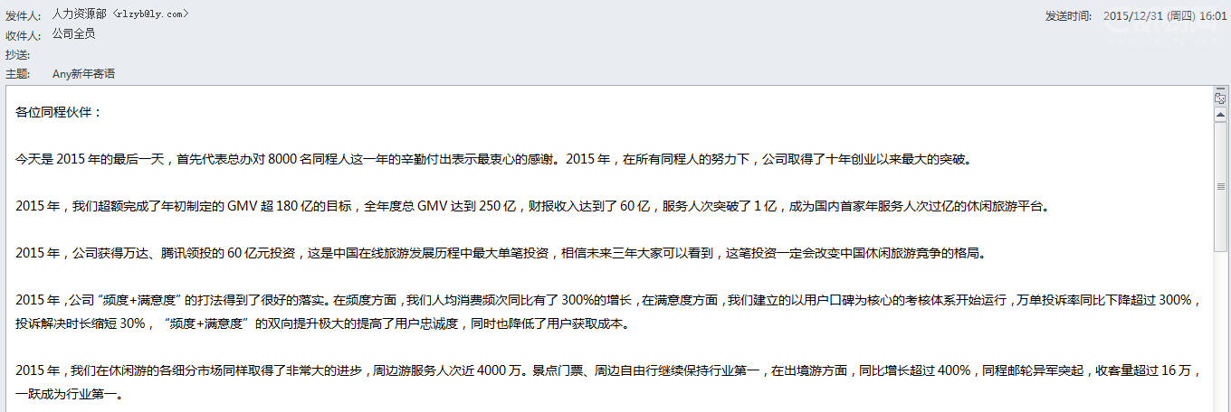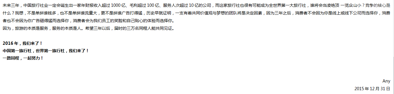 今天是2015年的最后一天,首先代表总办对8000名同程人这一年的辛勤付出表示最衷心的感谢。2015年,在所有同程人的努力下,公司取得了十年创业以来最大的突破。