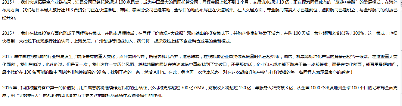 2015年,我们快速拓展全产业链布局,汇景公司已经托管超过100家景点,成为中国最大的景区托管公司,同程金服上线不到1个月,交易流水超过10亿,正在探索同程独有的“旅游+金融”的发展模式,在海外布局方面,我们与日本最大旅行社HIS合资公司正在快速推进,韩国、泰国分公司已经落地,全球目的地的布局正在快速展开。在大交通方面,专业航司高端人才已经到位,虚拟航司已经设立,与全球航司的对接已经开始。