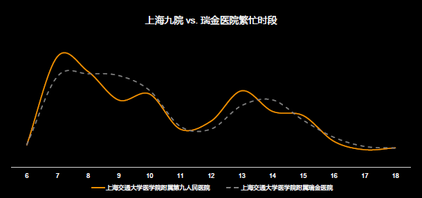 以上海交通大学医学院附属第九人民医院为例,到上海九院去的人群在每天早晨6点到8点最多,7点钟达到高峰,这一时期的出行数量相当于午后出行数量的两到三倍。与上海白领的上班高峰时间9点相比,病患人群的出行时间提前了整整两个小时,可见看病一事在人们心中有多么郑重。