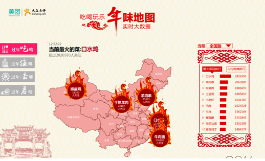 美团大众点评“年味地图”相关负责人介绍,“年味地图”的背后,是美团大众点评专门为此建立的大数据模型,挖掘、梳理了双方在本地生活领域的搜索数据、浏览数据、交易数据以及评论数据(UGC:用户提供内容)等,希望能通过对大数据的创新应用服务于媒体、全国百姓和千万商户。
