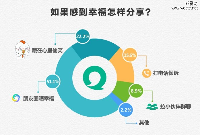 儿歌里说“如果感到幸福,你就拍拍手”,而在当下的移动互联网时代,人们会怎样分享幸福呢?易信此次的调查显示,51.1%的易信网友愿意选择在朋友圈或各种社交软件里“晒幸福”;排在第二位的是“藏在心里偷笑”,占比22.2%。此外,“打电话倾诉”这个最传统的方式,占比15.6%。