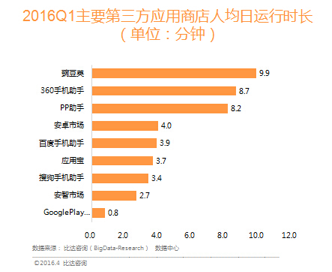根据比达咨询发布的《2016年Q1移动应用商店统计报告》显示,移动应用市场用户规模达到了4.47亿,环比仅增长了0.8%,可见智能手机和移动应用的红利消失了。而从市场格局分布看,2016年Q1期间,百度系以31.6%稳居第一,应用宝以23.6%排第二,360手机助手以22.2%排第三,豌豆荚以7.1%排第四,而PP助手以6.6%的活跃用户市场份额位列第五位。