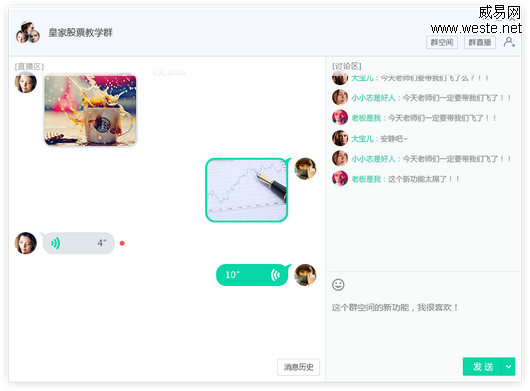 易信群的独立空间,是群好友的私密地盘,有的话和图片只分享给懂你的人看。在易信聊天群的右上角,点击群空间按钮(是一个小房子的页面符号),记下重要的事,群里所有人都能看到;也可以记录出行的心情和发布外出游玩的照片,让宅在家里的群好友一起在路上。