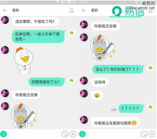 易信网友Sandy就遇到类似的“尴尬”,自从老爸老妈会用易信之后,几乎每天都能收到爸妈发来的问候消息,有段时间他们迷上了用表情包,还因此闹过乌龙。有一次妈妈发来一个阿鸡米德一脸怒容拿菜刀的表情,她以为妈妈生气了,没想到妈妈想说的是“爸爸正在厨房切菜”,让Sandy哭笑不得。