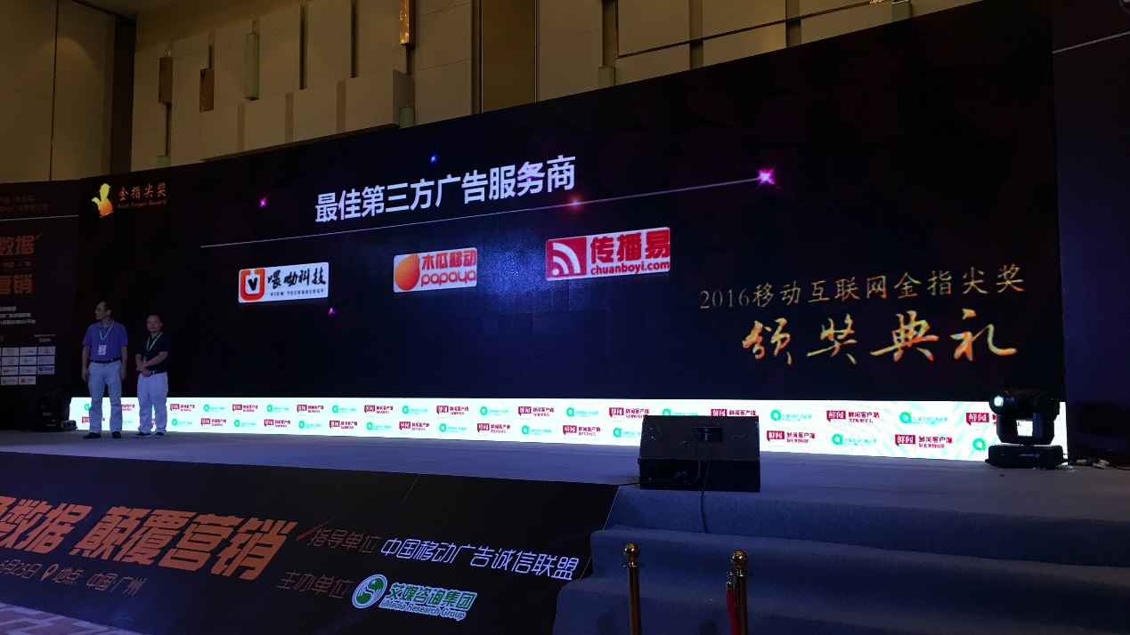 在大会当天,移动营销行业大奖——2016中国移动互联网金指尖奖颁奖盛典中,喂呦科技作为中国智能电视营销领军企业,凭借在智能电视广告市场的卓越表现,在500企业角逐中脱颖而出,一举斩获“最佳第三方广告服务商”大奖。